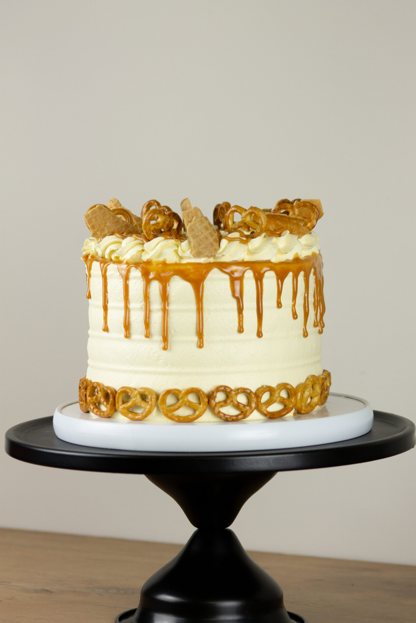 Moist vanilla cake layers, delicious caramel and vanilla buttercream filling and lots of love! A classic combination for such a showstopper!